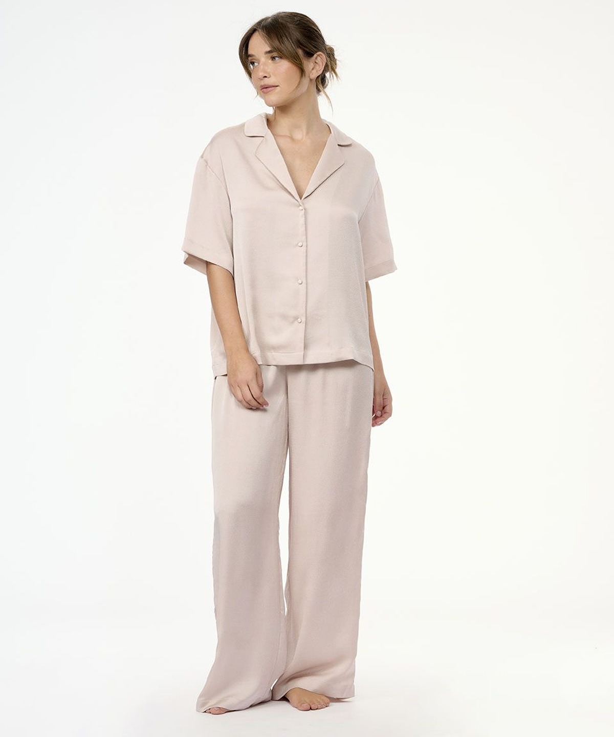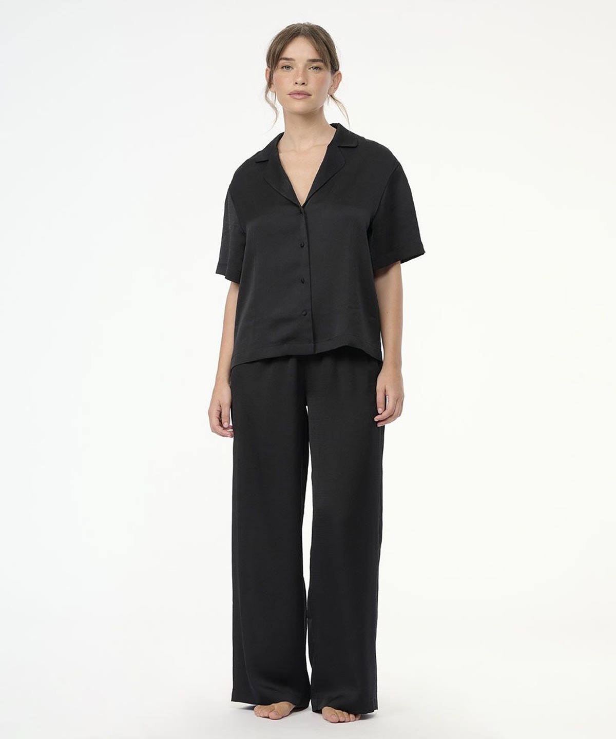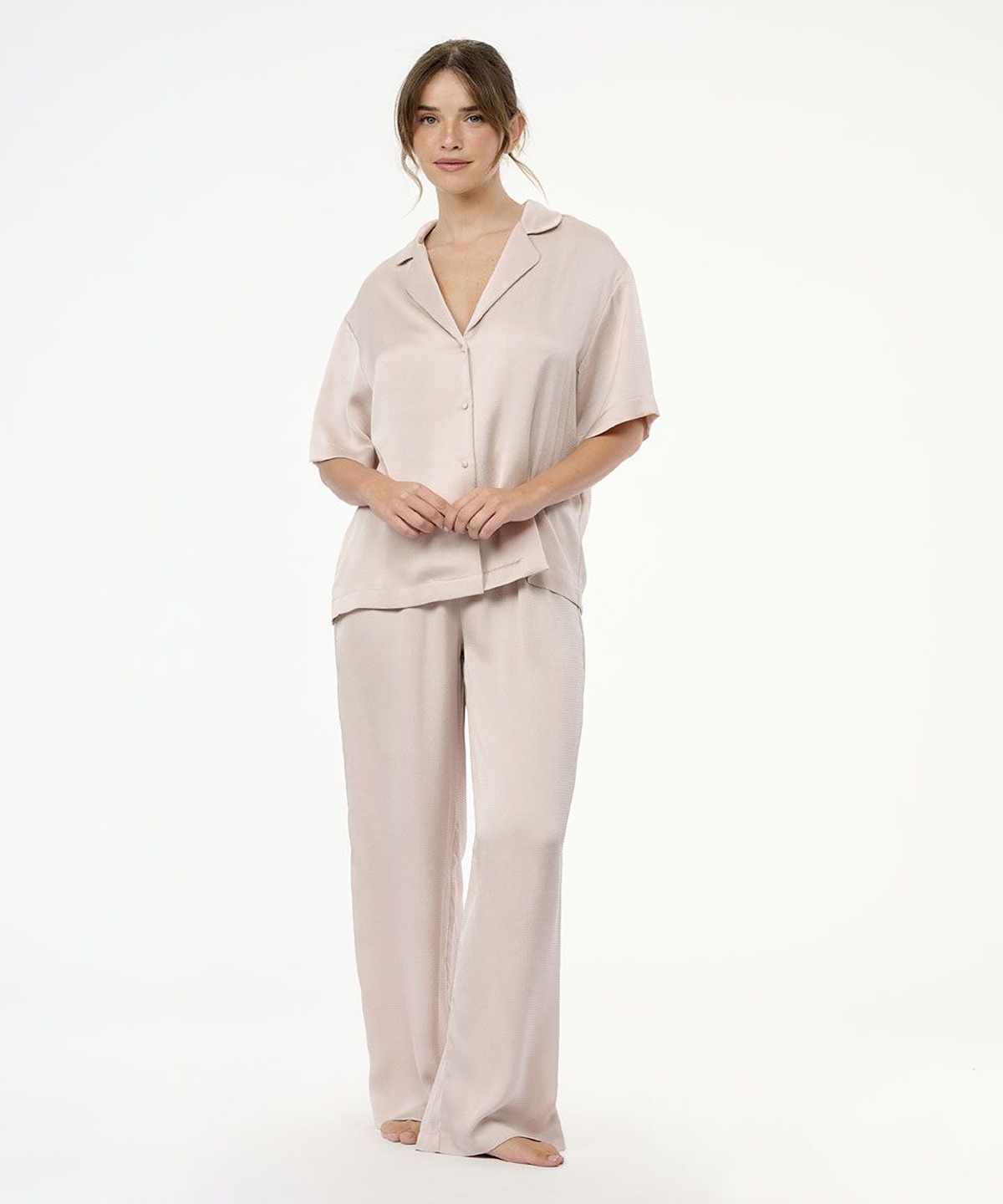• סט פיג'מה יוקרתי משני חלקים – חולצה מכופתרת עם צווארון קלאסי ומכנסיים ארוכים ורפויים