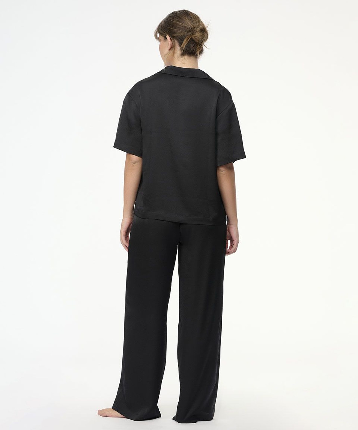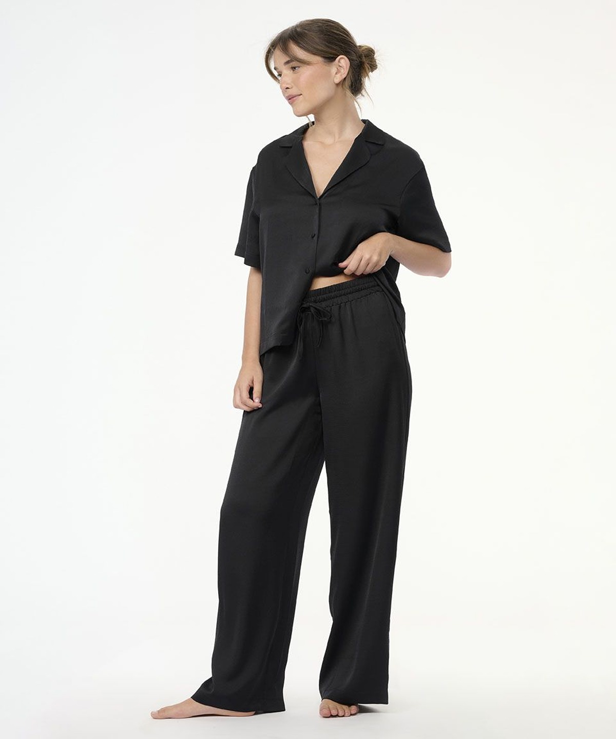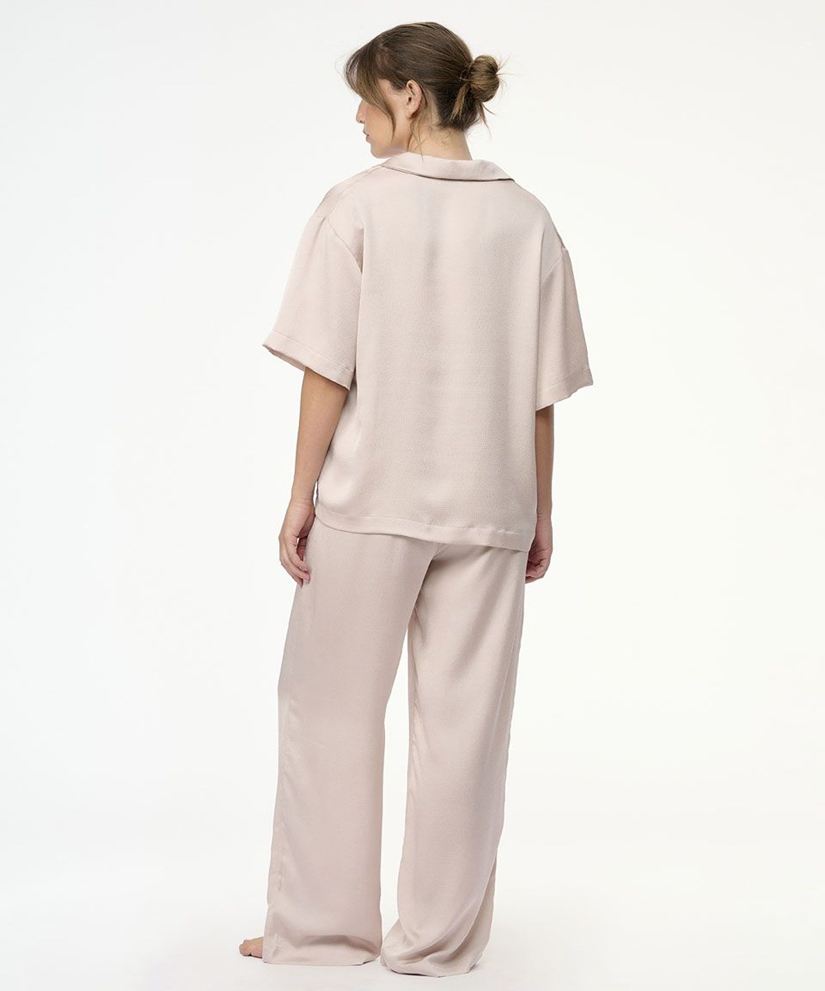 • סט פיג'מה יוקרתי משני חלקים – חולצה מכופתרת עם צווארון קלאסי ומכנסיים ארוכים ורפויים